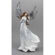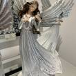 To figurka anioła dekoracyjnego – wysoka, smukła postać w długiej, białej sukni zdobionej delikatnymi kryształkami. Anioł trzyma gołąbka w dłoniach, a na plecach ma duże, puszyste, białe skrzydła z piór. Całość wygląda elegancko i subtelnie – idealna ozdoba w stylu świątecznym lub jako dekoracja wnętrza w klimacie glamour.