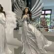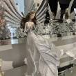 To figurka anioła dekoracyjnego – wysoka, smukła postać w długiej, białej sukni zdobionej delikatnymi kryształkami. Anioł trzyma gołąbka w dłoniach, a na plecach ma duże, puszyste, białe skrzydła z piór. Całość wygląda elegancko i subtelnie – idealna ozdoba w stylu świątecznym lub jako dekoracja wnętrza w klimacie glamour.