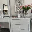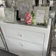 Komoda wykonana z białego szkła blat zdobiony kryształkami posiada trzy szuflady . Piękna i efektowna kolekcja w stylu Glamour rozświetli twoje wnętrze. Szuflady zdobione uchwytami z kryształków. Do komody proponujemy szafki nocne z tej samej kolekcji oraz toaletkę.
